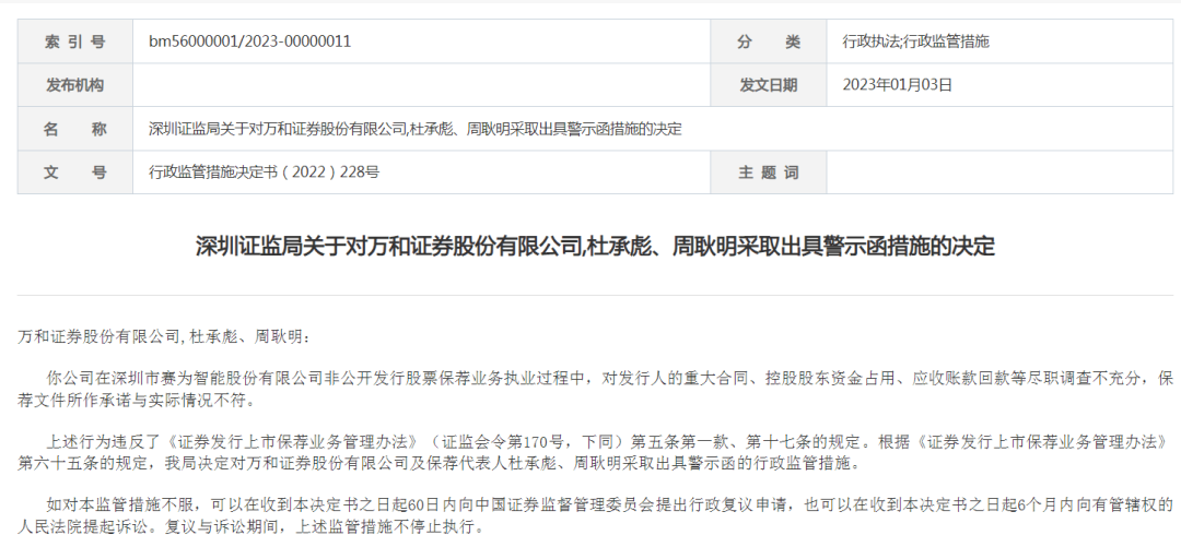 此外,五天三板的赛为智能()收到了深交所关心函。受限金额为2454万元。赛为智能高管逢高减持也遭到了监管关心。赛为智能收到深圳证监局下发的惩罚通知书,